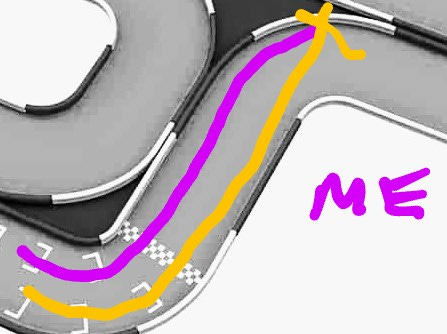 Behind me: a pack of ravenous teenagers who I don’t want to slow down for. Ahead of me and coming up fast: a trusted friend I had been racing with for over a year. His kart wasn’t great, he was going pretty slow, I couldn’t tell if it was actually a set up or if he was giving up. In the moment I made a compromise to go wide on the entry for the first turn which would allow the hot lapper to get by me.